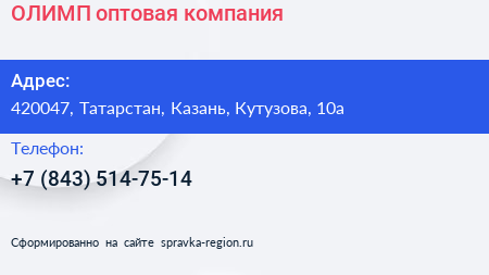 ОЛИМП, оптовая компания по адресу 420047, Татарстан, Казань, Кутузова, 10а в дальнейшем Организация, размещена в следующих категориях: