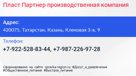 Пласт Партнер, производственная компания по адресу 420075, Татарстан, Казань, Кленовая 3-я, 9 в дальнейшем Организация, размещена в следующих категориях: