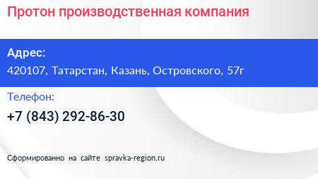 Протон, производственная компания по адресу 420107, Татарстан, Казань, Островского, 57г в дальнейшем Организация, размещена в следующих категориях: