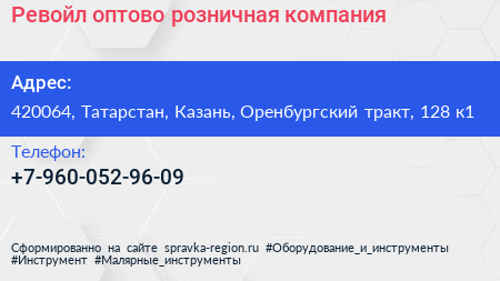 Ревойл, оптово-розничная компания по адресу 420064, Татарстан, Казань, Оренбургский тракт, 128 к1 в дальнейшем Организация, размещена в следующих категориях: