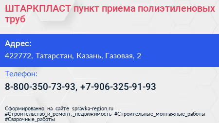 ШТАРКПЛАСТ, пункт приема полиэтиленовых труб по адресу 422772, Татарстан, Казань, Газовая, 2 в дальнейшем Организация, размещена в следующих категориях: