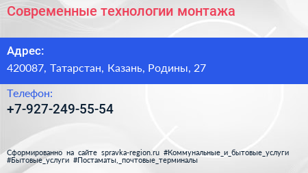 Современные технологии монтажа по адресу 420087, Татарстан, Казань, Родины, 27 в дальнейшем Организация, размещена в следующих категориях: