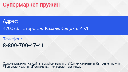 Супермаркет пружин по адресу 420073, Татарстан, Казань, Седова, 2 к1 в дальнейшем Организация, размещена в следующих категориях: