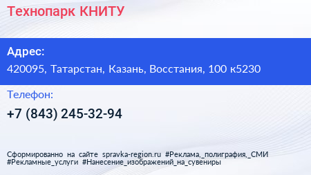 Технопарк, КНИТУ по адресу 420095, Татарстан, Казань, Восстания, 100 к5230 в дальнейшем Организация, размещена в следующих категориях: