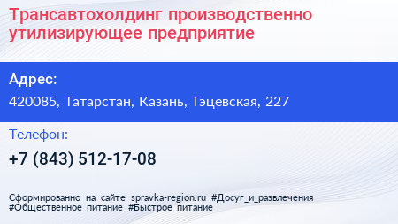 Трансавтохолдинг, производственно-утилизирующее предприятие по адресу 420085, Татарстан, Казань, Тэцевская, 227 в дальнейшем Организация, размещена в следующих категориях:
