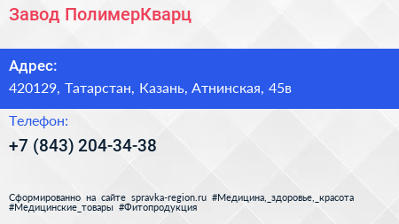Завод ПолимерКварц по адресу 420129, Татарстан, Казань, Атнинская, 45в в дальнейшем Организация, размещена в следующих категориях: