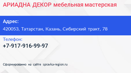 АРИАДНА-ДЕКОР, мебельная мастерская по адресу 420053, Татарстан, Казань, Сибирский тракт, 78 в дальнейшем Организация, размещена в следующих категориях: