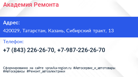 Академия Ремонта по адресу 420029, Татарстан, Казань, Сибирский тракт, 13 в дальнейшем Организация, размещена в следующих категориях: