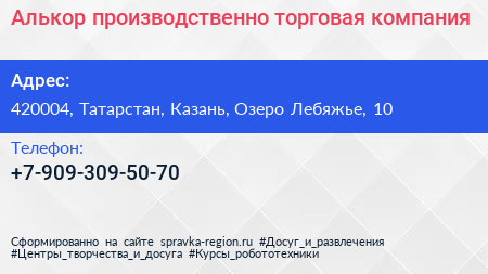 Алькор, производственно-торговая компания по адресу 420004, Татарстан, Казань, Озеро Лебяжье, 10 в дальнейшем Организация, размещена в следующих категориях: