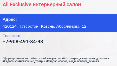 All Exclusive, интерьерный салон по адресу 420124, Татарстан, Казань, Абсалямова, 12 в дальнейшем Организация, размещена в следующих категориях: