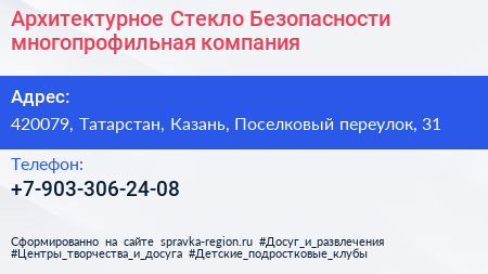 Архитектурное Стекло Безопасности, многопрофильная компания по адресу 420079, Татарстан, Казань, Поселковый переулок, 31 в дальнейшем Организация, размещена в следующих категориях: