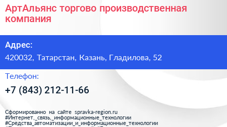 АртАльянс, торгово-производственная компания по адресу 420032, Татарстан, Казань, Гладилова, 52 в дальнейшем Организация, размещена в следующих категориях:
