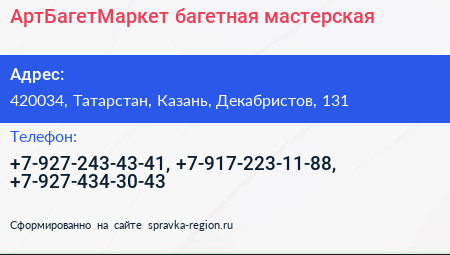 АртБагетМаркет, багетная мастерская по адресу 420034, Татарстан, Казань, Декабристов, 131 в дальнейшем Организация, размещена в следующих категориях: