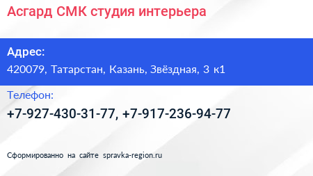 Асгард СМК, студия интерьера по адресу 420079, Татарстан, Казань, Звёздная, 3 к1 в дальнейшем Организация, размещена в следующих категориях: