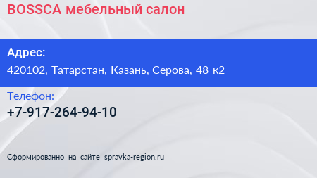 BOSSCA, мебельный салон по адресу 420102, Татарстан, Казань, Серова, 48 к2 в дальнейшем Организация, размещена в следующих категориях: