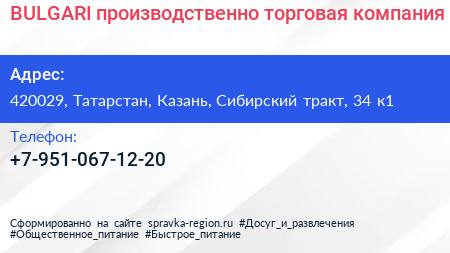 BULGARI, производственно-торговая компания по адресу 420029, Татарстан, Казань, Сибирский тракт, 34 к1 в дальнейшем Организация, размещена в следующих категориях: