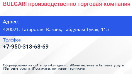 BULGARI, производственно-торговая компания по адресу 420021, Татарстан, Казань, Габдуллы Тукая, 115 в дальнейшем Организация, размещена в следующих категориях: