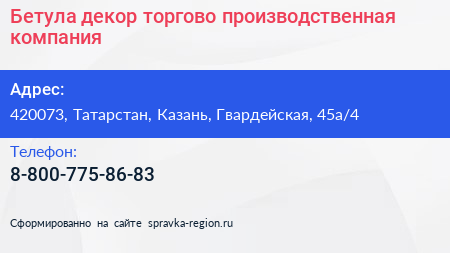Бетула-декор, торгово-производственная компания по адресу 420073, Татарстан, Казань, Гвардейская, 45а/4 в дальнейшем Организация, размещена в следующих категориях: