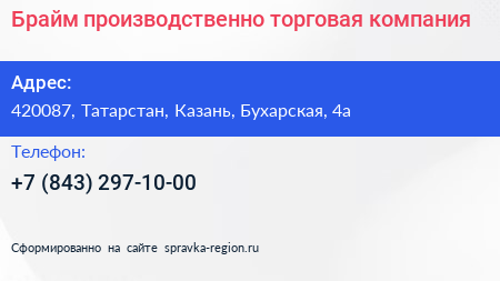 Брайм, производственно-торговая компания по адресу 420087, Татарстан, Казань, Бухарская, 4а в дальнейшем Организация, размещена в следующих категориях: