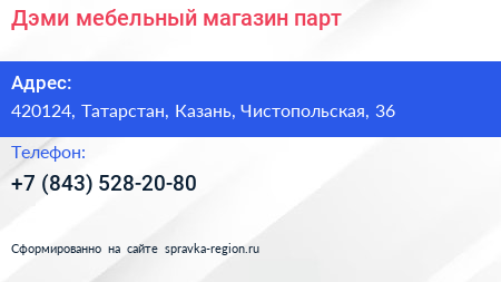 Дэми, мебельный магазин парт по адресу 420124, Татарстан, Казань, Чистопольская, 36 в дальнейшем Организация, размещена в следующих категориях: