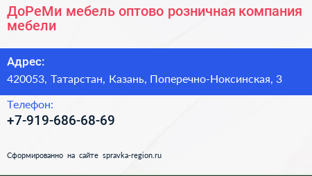 ДоРеМи мебель, оптово-розничная компания мебели по адресу 420053, Татарстан, Казань, Поперечно-Ноксинская, 3 в дальнейшем Организация, размещена в следующих категориях: