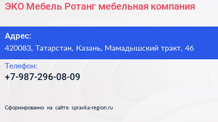 ЭКО Мебель Ротанг, мебельная компания по адресу 420083, Татарстан, Казань, Мамадышский тракт, 46 в дальнейшем Организация, размещена в следующих категориях: