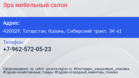 Эра, мебельный салон по адресу 420029, Татарстан, Казань, Сибирский тракт, 34 к1 в дальнейшем Организация, размещена в следующих категориях:
