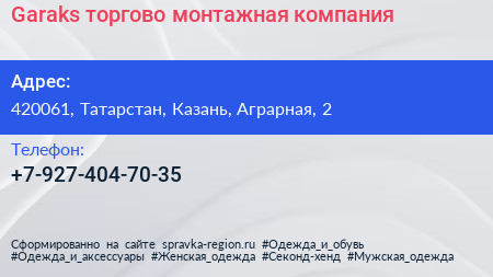 Garaks, торгово-монтажная компания по адресу 420061, Татарстан, Казань, Аграрная, 2 в дальнейшем Организация, размещена в следующих категориях: