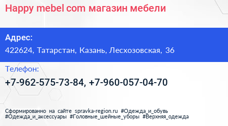 Happy-mebel.com, магазин мебели по адресу 422624, Татарстан, Казань, Лесхозовская, 36 в дальнейшем Организация, размещена в следующих категориях: