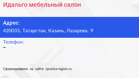 Идальго, мебельный салон по адресу 420033, Татарстан, Казань, Лазарева, 9 в дальнейшем Организация, размещена в следующих категориях: