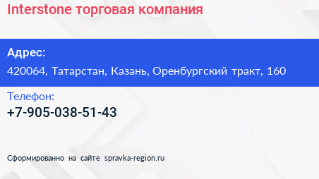 Interstone, торговая компания по адресу 420064, Татарстан, Казань, Оренбургский тракт, 160 в дальнейшем Организация, размещена в следующих категориях: