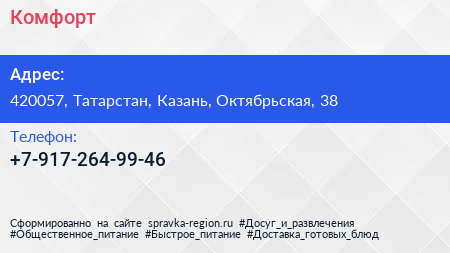Комфорт по адресу 420057, Татарстан, Казань, Октябрьская, 38 в дальнейшем Организация, размещена в следующих категориях: