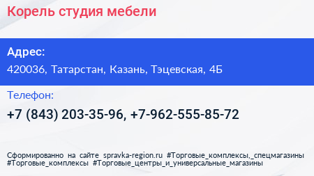 Корель, студия мебели по адресу 420036, Татарстан, Казань, Тэцевская, 4Б в дальнейшем Организация, размещена в следующих категориях: