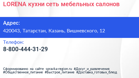 LORENA кухни, сеть мебельных салонов по адресу 420043, Татарстан, Казань, Вишневского, 12 в дальнейшем Организация, размещена в следующих категориях: