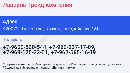 Лаверна Трейд, компания по адресу 420073, Татарстан, Казань, Гвардейская, 16Б в дальнейшем Организация, размещена в следующих категориях: