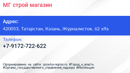 МГ строй, магазин по адресу 420053, Татарстан, Казань, Журналистов, 62 к9а в дальнейшем Организация, размещена в следующих категориях: