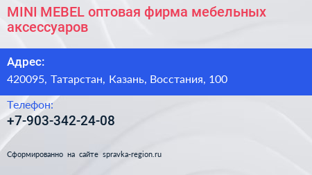 MINI-MEBEL, оптовая фирма мебельных аксессуаров по адресу 420095, Татарстан, Казань, Восстания, 100 в дальнейшем Организация, размещена в следующих категориях: