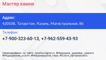 Мастер камня по адресу 420108, Татарстан, Казань, Магистральная, 86 в дальнейшем Организация, размещена в следующих категориях:
