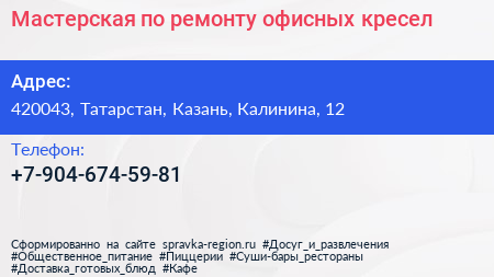 Мастерская по ремонту офисных кресел по адресу 420043, Татарстан, Казань, Калинина, 12 в дальнейшем Организация, размещена в следующих категориях: