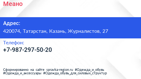 Меано по адресу 420074, Татарстан, Казань, Журналистов, 27 в дальнейшем Организация, размещена в следующих категориях: