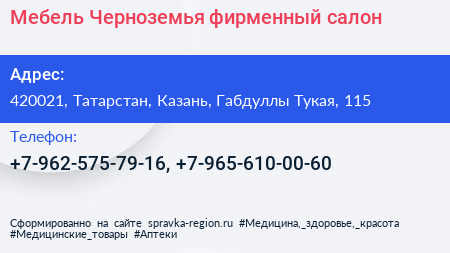 Мебель Черноземья, фирменный салон по адресу 420021, Татарстан, Казань, Габдуллы Тукая, 115 в дальнейшем Организация, размещена в следующих категориях: