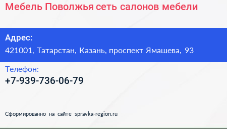 Мебель Поволжья, сеть салонов мебели по адресу 421001, Татарстан, Казань, проспект Ямашева, 93 в дальнейшем Организация, размещена в следующих категориях: