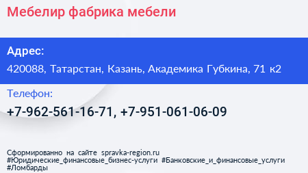Мебелир, фабрика мебели по адресу 420088, Татарстан, Казань, Академика Губкина, 71 к2 в дальнейшем Организация, размещена в следующих категориях: