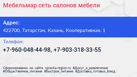 Мебельмар, сеть салонов мебели по адресу 422700, Татарстан, Казань, Кооперативная, 1 в дальнейшем Организация, размещена в следующих категориях: