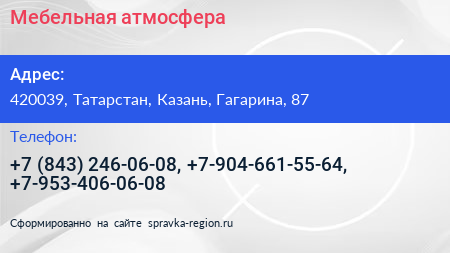 Мебельная атмосфера по адресу 420039, Татарстан, Казань, Гагарина, 87 в дальнейшем Организация, размещена в следующих категориях: