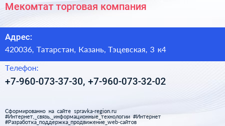 Мекомтат, торговая компания по адресу 420036, Татарстан, Казань, Тэцевская, 3 к4 в дальнейшем Организация, размещена в следующих категориях: