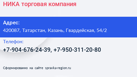НИКА, торговая компания по адресу 420087, Татарстан, Казань, Гвардейская, 54/2 в дальнейшем Организация, размещена в следующих категориях: