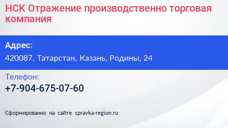 НСК-Отражение, производственно-торговая компания по адресу 420087, Татарстан, Казань, Родины, 24 в дальнейшем Организация, размещена в следующих категориях: