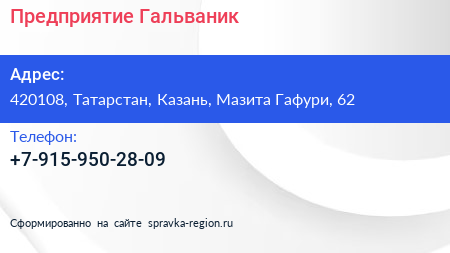 Предприятие Гальваник по адресу 420108, Татарстан, Казань, Мазита Гафури, 62 в дальнейшем Организация, размещена в следующих категориях: