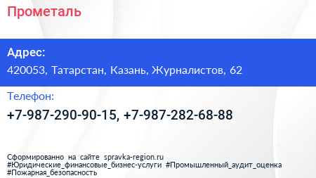 Прометаль по адресу 420053, Татарстан, Казань, Журналистов, 62 в дальнейшем Организация, размещена в следующих категориях: